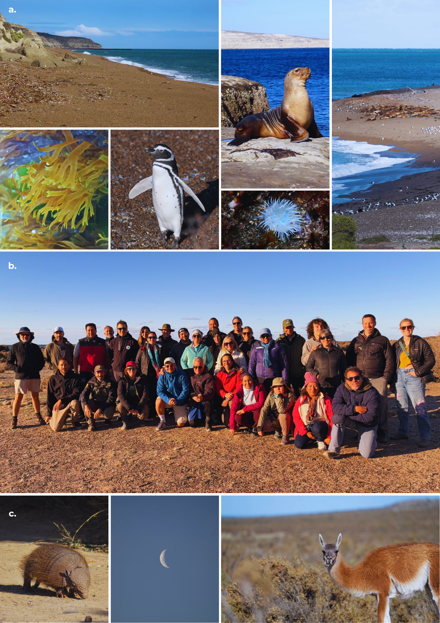 a: Coastal landscapes and some of the intertidal species observed during fieldwork in Península Valdés, Argentina. From left to right: Dictyota dichotoma (brown algae), Spheniscus magellanicus (Magellanic penguin), Otaria flavescens (South American sea lion), and an unidentified intertidal sea anemone. b: Group photo of the MBON Pole to Pole workshop participants during field activities. c: Terrestrial environments adjacent to the intertidal zone, featuring native wildlife such as a large hairy armadillo (Chaetophractus villosus) and a guanaco (Lama guanicoe). Photo credits: Luke R. Thompson, Gabriela Vélez-Rubio, Erasmo C. Macaya, Edgardo Londoño-Cruz, and Gonzalo Bravo. |